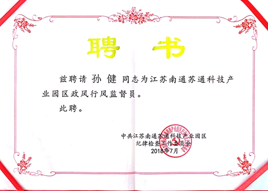 蘇通科技產業(yè)園區(qū)黨工委副書記金志偉充分肯定了南通公司紀委工作,對墾地廉潔共建和南通公司紀委工作提出了具體要求。座談會上,園區(qū)紀工委向南通公司紀委書記孫健頒發(fā)了蘇通科技產業(yè)園區(qū)行風監(jiān)督員的聘書。