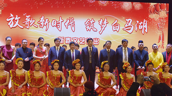 大會(huì)緊接著還舉行了“放歌新時(shí)代、筑夢(mèng)白馬湖”新春文藝演出。姚春華在演出前作了熱情洋溢的致辭。來(lái)自江蘇青春歌舞團(tuán)的演員及白馬湖駿逸舞蹈隊(duì)的隊(duì)員們?yōu)榕c會(huì)代表及部分職工居民們帶來(lái)了《盛世龍騰耀中華》《春天的故事》《春雨沐浴白馬湖》等十多個(gè)精彩的文藝節(jié)目,整場(chǎng)演出最后在舞蹈《不忘初心 砥礪前行》中落下了帷幕。