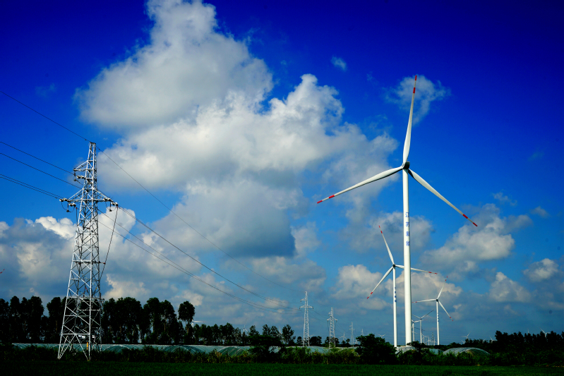 轉動的風輪,高高的輸電線鐵塔,鑲嵌在藍天與綠禾之間。
