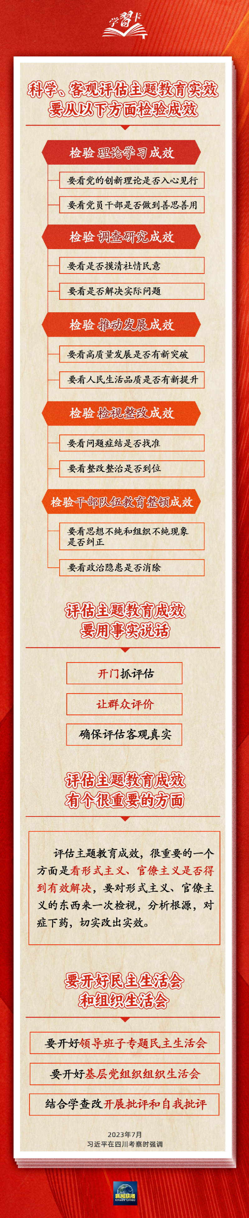 當前,全黨正在深入開展學(xué)習(xí)貫徹習(xí)近平新時代中國特色社會主義思想主題教育。7月25日至27日,習(xí)近平總書記在四川考察時強調(diào),第一批主題教育只剩下一個多月時間,各級黨組織要落實黨中央部署,善始善終、慎終如始,務(wù)求實效。要對主題教育的實效進行科學(xué)、客觀評估。具體從哪些方面進行評估,評估有哪些標準?總書記提出明確要求,一起學(xué)習(xí)↓