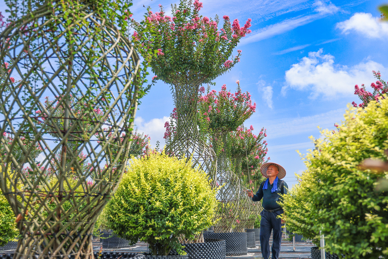 8月14日,在江蘇省鹽城市射陽縣,江蘇農(nóng)墾新洋農(nóng)場容器苗項目基地,管理人員正在養(yǎng)護紫薇花瓶。近年來,新洋農(nóng)場利用容器苗基地優(yōu)勢,在栽培方式上大膽嘗試,通過扦插培育,實現(xiàn)了自繁自育栽培技術(shù)的新突破,容器栽培的模式使苗圃成活率更高、綠化效果更好,優(yōu)良的品質(zhì)廣受全國各地綠化項目方的青睞。