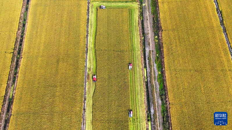 江蘇省連云港市海州區(qū)崗埠農(nóng)場(chǎng)工作人員在搶收水稻(無人機(jī)照片)。新華社發(fā)(耿玉和 攝)
