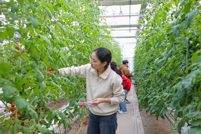 2月12日,在連云港市云臺農場興墾科技番茄采摘智能玻璃溫室大棚內,工作人員在采摘采用無土栽培技術種植的西紅柿。 吳成瑤 攝 (視覺江蘇網(wǎng)供圖)