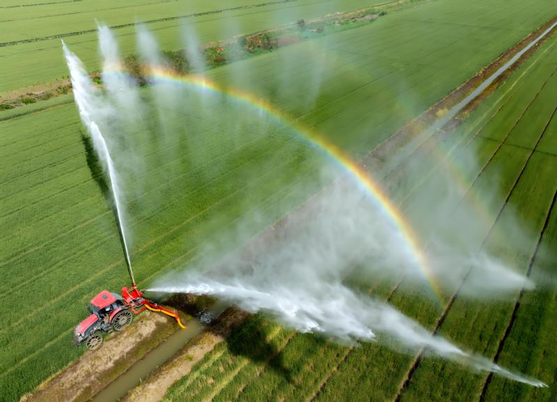 5月2日,正值冬小麥進(jìn)入開花灌漿關(guān)鍵期,江蘇省農(nóng)墾白馬湖農(nóng)場調(diào)集10多臺(tái)噴水機(jī)進(jìn)行分區(qū)抗旱作業(yè),確保近5萬畝冬小麥增產(chǎn)增收。圖為工作人員駕駛噴水機(jī)對麥田進(jìn)行噴灌作業(yè)。賀敬華 攝 (視覺江蘇網(wǎng)供圖)