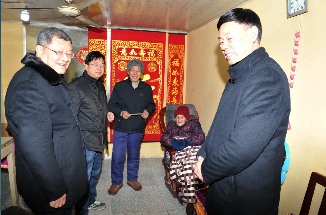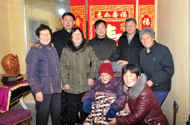 “我們黨政工領導來給您拜年了!”王進強一進門就對坐在沙發(fā)上的百歲老人說。