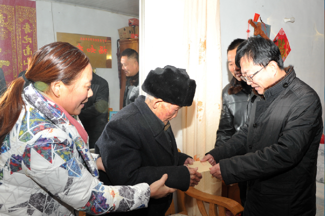 “今天我們代表農(nóng)場的黨政工領導一起來慰問百歲老人,祝愿老人福如東海、壽比南山。”王進強一邊把一封裝有慰問金的信封交到老子的兒女手中,一邊熱情地說道。