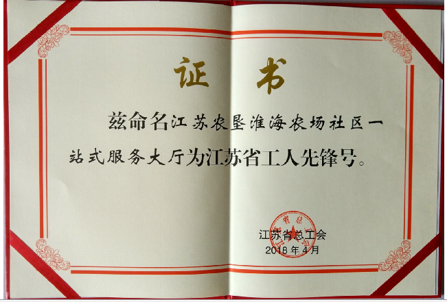 近日,省總工會(huì)授予江蘇農(nóng)墾淮海農(nóng)場(chǎng)社區(qū)一站式服務(wù)大廳獲江蘇省“工人先鋒號(hào)”榮譽(yù)稱(chēng)號(hào),這是淮海農(nóng)場(chǎng)社區(qū)首次獲此殊榮。
