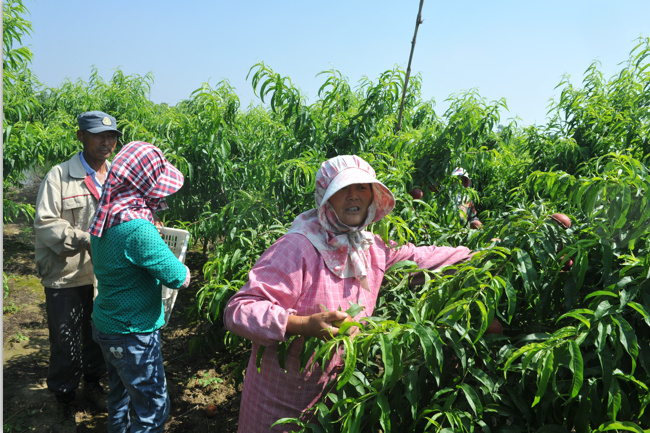 “到農(nóng)場(chǎng)來干活,距家又不遠(yuǎn),而且常年都有事做,家務(wù)事又不耽擱,每年很輕松收入就近兩萬元。”李老漢一邊拎著塑料筐跟在婦女后邊放著桃,一邊跟筆者說著。三四年前,李老漢就開始到果園里來務(wù)工,主要從事果樹的修剪、施肥、疏花、采摘、鋤草、澆水等管理工作。與李老漢那樣,僅新東村在果園常年打工的還有其他10多名村民。