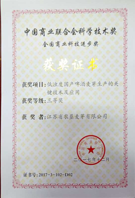 大會同時(shí)發(fā)布了2016年和2017年中國商業(yè)聯(lián)合會科學(xué)技術(shù)獎(jiǎng)、服務(wù)業(yè)科技創(chuàng)新評獎(jiǎng)結(jié)果,以及2017年全國商業(yè)質(zhì)量獎(jiǎng)、零售企業(yè)服務(wù)質(zhì)量獎(jiǎng)五星級單位。蘇墾麥芽公司《低濁度國產(chǎn)啤酒麥芽生產(chǎn)的關(guān)鍵技術(shù)及應(yīng)用》獲得全國商業(yè)科技進(jìn)步獎(jiǎng)三等獎(jiǎng)。