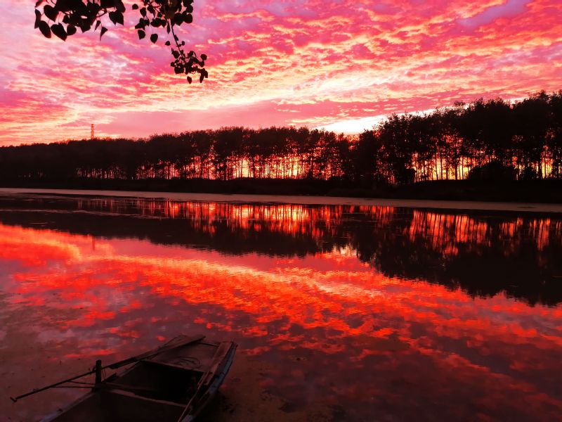 落日的余輝映照在蒼穹的大地上,天際一片輝煌,飄蕩在空中的浮云,已不再是純潔雪白的,而是緋紅緋紅的,色彩絢麗明媚。天空是紅的,河水是紅的,通紅通紅的,紅得透亮透亮,紅得讓人陶醉,真可謂:“殘云亂渡染紅天,霞光萬道映大河。”