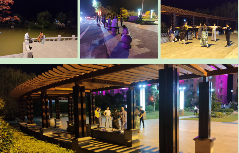 在淮海農(nóng)場,當(dāng)夜晚來臨的時(shí)候,許多人都喜歡到淮海公園中去走一走,看一看,或坐一坐,跳一跳,因?yàn)樵诠珗@那兒,既可以與居民們相約聊天,相互散步,也可以坐在燈光下,欣賞著河岸的風(fēng)光,享受下濃墨重彩的韻味。當(dāng)然,也可以在怡然自得中,聽一聽那些舞蹈人播放的音樂,目睹下他們翩翩起舞的姿態(tài),而對忙碌一天的居民來說,在這里可以找到最原始的放松形式,讓身心的疲憊在公園中得到充分地釋放。