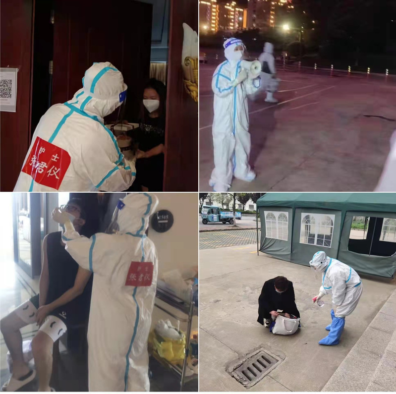 隔離點的工作繁瑣、繁雜,防護措施嚴(yán)格,每次進入隔離區(qū)前要在準(zhǔn)備間戴帽子和N95口罩、穿防護服、戴護目鏡、穿靴套等保護設(shè)施,穿戴好防護用品后,她給隔離人員分發(fā)三餐,配備1:1000的消毒液進行隔離房間的環(huán)境消殺,并將所有隔離人員的物資、生活用品、所產(chǎn)生的醫(yī)療及生活垃圾都要一層一層爬樓梯搬運,由于射陽西區(qū)人才公寓隔離點沒有電梯,再加上嚴(yán)實密不透風(fēng)的防護服,就是一動不動,也會大汗淋漓,每次都是內(nèi)層衣濕透,汗流浹背,工作完成一半就已經(jīng)精疲力盡,只能原地休息幾分鐘再繼續(xù)上下樓梯完成工作,一套流程做下來都要近五個小時。有時面對不理解、有抵觸情緒的人員,她會以盡心盡力的服務(wù)給他們以溫暖、依靠、希望及強有力的支撐,她說:隔離是對自己負(fù)責(zé)、對大家負(fù)責(zé)、更是對我們國家負(fù)責(zé),你們是為國家早日戰(zhàn)勝疫情作貢獻(xiàn),鼓勵他們積極配合隔離點做好隔離工作。