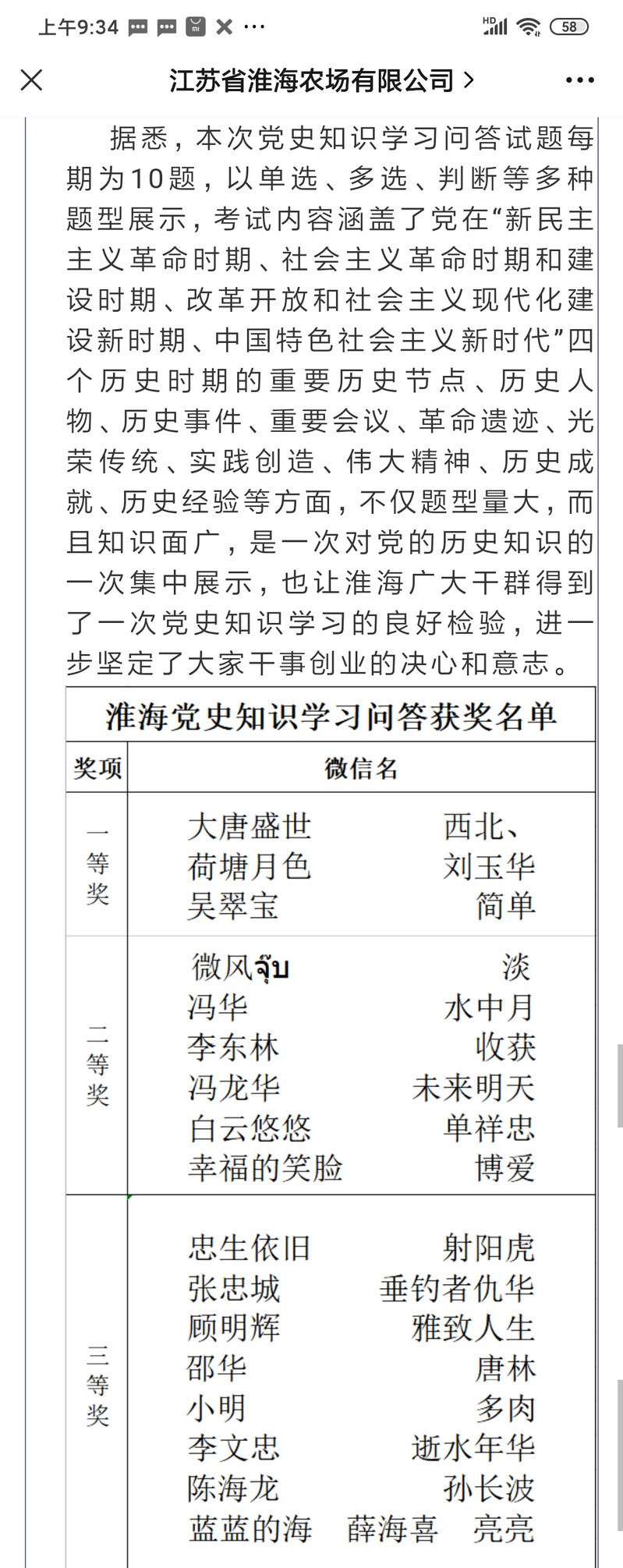 “作為農(nóng)場老干部,我一直關(guān)注淮海農(nóng)場的大事,這次為慶祝中國共產(chǎn)黨成立100周年大慶,農(nóng)場黨委工作部去年6月1日通過微信公眾號發(fā)布的答題頁面進(jìn)行答題活動時,我本著試試看的心理,第一次答題結(jié)束就獲得了100分,讓我的信心大增?!背潭ɑ陬I(lǐng)獎名單上簽上自己的名字后興趣盎然地說,“于是在接下來的每周黨史知識學(xué)習(xí)問答試題,我都是認(rèn)真對待,直到推出了26期淮海黨史學(xué)習(xí)教育知識問答全部結(jié)束。”