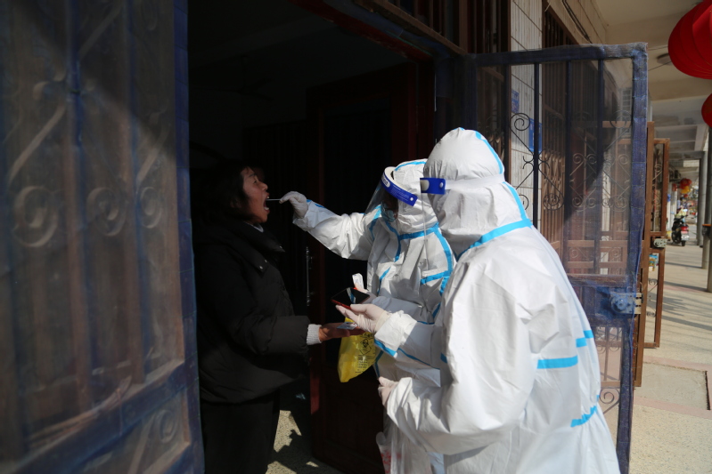 3月5日,連云港市海州區(qū)通報(bào)發(fā)生新冠肺炎疫情,形勢(shì)十分嚴(yán)峻。崗埠上下迅速行動(dòng)起來(lái),按照要求組織開(kāi)展全員核酸檢測(cè)。全員核酸檢測(cè)要求一天內(nèi)對(duì)崗埠所有在家人員進(jìn)行檢測(cè),農(nóng)場(chǎng)四個(gè)點(diǎn)位同時(shí)開(kāi)始,負(fù)責(zé)檢測(cè)的人員特別緊張。馬素蓮得知這一情況,主動(dòng)和相關(guān)人員溝通,暫停了自家門(mén)診,帶領(lǐng)醫(yī)生錢(qián)冬梅、護(hù)士錢(qián)明霞加入了振興廣場(chǎng)籃球場(chǎng)監(jiān)測(cè)點(diǎn)的核酸檢測(cè)人員隊(duì)伍。從3月5日到11日,她們?nèi)艘恢眻?jiān)守在核酸檢測(cè)一線(xiàn),每天檢測(cè)人員合計(jì)達(dá)到兩三千人。有時(shí)候,她們需要配合網(wǎng)格員深入鎮(zhèn)區(qū)、生產(chǎn)區(qū)各居委會(huì)上門(mén)為行動(dòng)不便的人員進(jìn)行采樣,足跡遍布大街小巷,密不透風(fēng)的防護(hù)服常常讓她們滿(mǎn)臉通紅透不過(guò)氣來(lái)。護(hù)士錢(qián)明霞告訴筆者,3月11日當(dāng)天,她負(fù)責(zé)部分小區(qū)的核酸采樣工作,光是6樓就爬了6次,腿最后跟灌了鉛一樣,挪不動(dòng)?!坝袝r(shí)候晚上嘴里吃著東西就睡著了。”