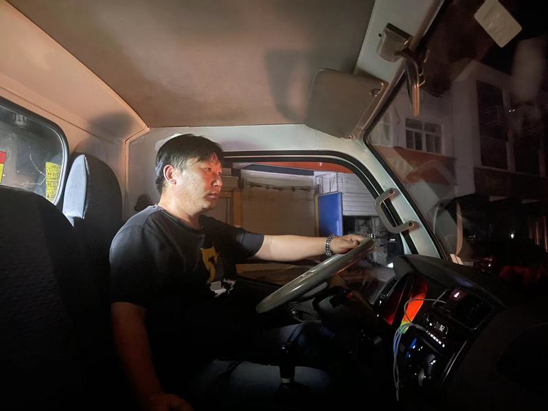 一個點一個點跑,一桶一桶裝,一車一車卸。戴玉剛對每個清運(yùn)點的位置熟悉得不能再熟悉,一天作業(yè)下來能跑40多公里。當(dāng)車?yán)锢幚硗戤叄麄冇珠_始洗車刷車……等到都弄干凈了才回家吃點東西,再睡上一覺。