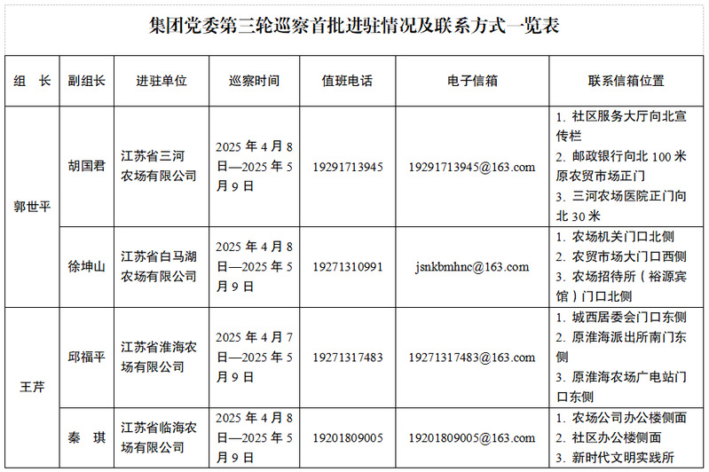 集團黨委巡察組將在被巡察農場現場巡察1個月左右,期間設立專門值班電話、電子信箱、聯系信箱等,主要受理反映被巡察農場黨委領導班子及其成員、相關重點崗位干部(含已離退休、已調離)問題的來信來電來訪,重點是關于違反政治紀律、組織紀律、廉潔紀律、群眾紀律、工作紀律和生活紀律等方面的舉報和反映。其他不屬于巡察受理范圍的信訪問題,將按規(guī)定由有關部門認真處理。信訪受理時間截止到2025年5月7日。