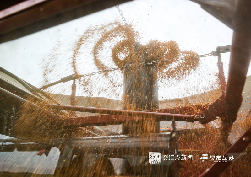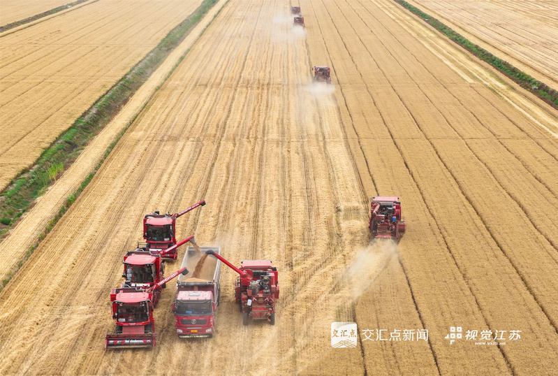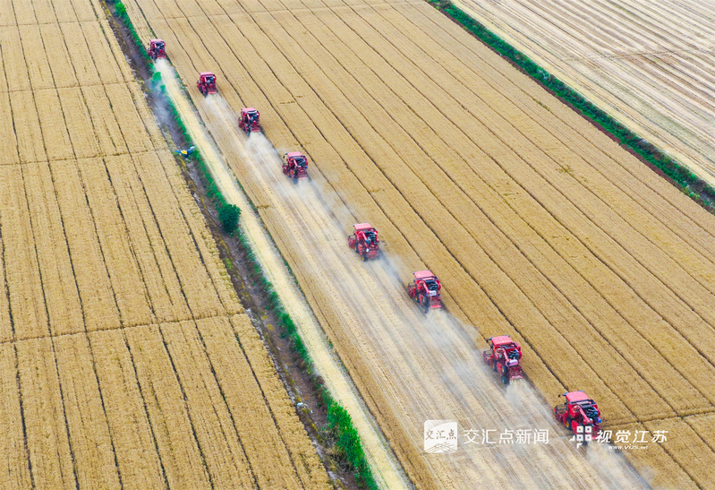 (特約攝影 許昌銀 錢厚紅 15:24攝 20:39上線)五月的麥田,金穗飄香。5月26日,淮安盱眙洪澤湖畔的江蘇農(nóng)墾三河農(nóng)場(chǎng)的3.82萬畝小麥開鐮收割。當(dāng)?shù)乩们绾锰鞖饧泳o收割,確保顆粒歸倉。