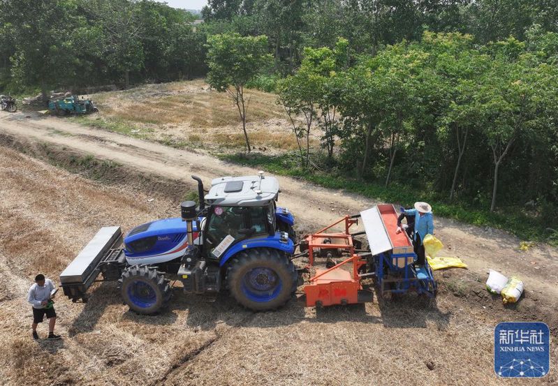 5月28日,揚州大學(xué)研制的“九合一”稻麥耕播機在三河農(nóng)場播稻種(無人機照片)。新華社記者 季春鵬 攝