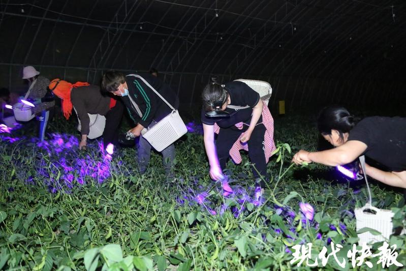“搜尋時一定要仔細(xì),左右兩邊都得留意,才能把豆丹抓全?!眴误w2號大棚的豆丹養(yǎng)殖負(fù)責(zé)人李加祥一邊熟練地捕捉豆丹,一邊向工作人員傳授經(jīng)驗(yàn),“豆丹和豆葉顏色相近,白天捕捉極易遺漏。但到了夜間,紫光燈一照,豆丹就像會發(fā)光的螢火蟲,清晰可見,不僅抓捕效率高,還能做到顆粒歸倉?!睘榇_保此次捕捉行動順利開展,園區(qū)提前規(guī)劃,從人員調(diào)配到工具準(zhǔn)備,每一個環(huán)節(jié)都精心部署,為高效捕捉打下堅(jiān)實(shí)基礎(chǔ)。