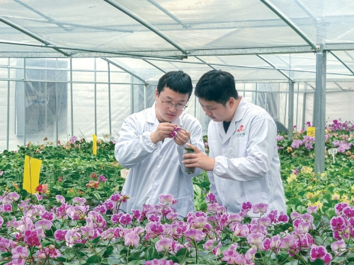 圖為農(nóng)場技術(shù)人員正在查看蝴蝶蘭種苗?!∈茉L者供圖