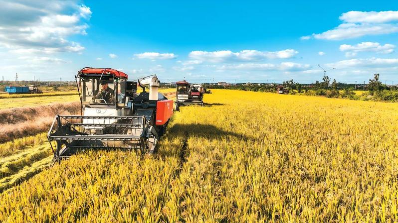 江蘇省鹽城市射陽(yáng)縣,江蘇農(nóng)墾新洋農(nóng)場(chǎng)工作人員搶收水稻。張偉生攝 (人民圖片)