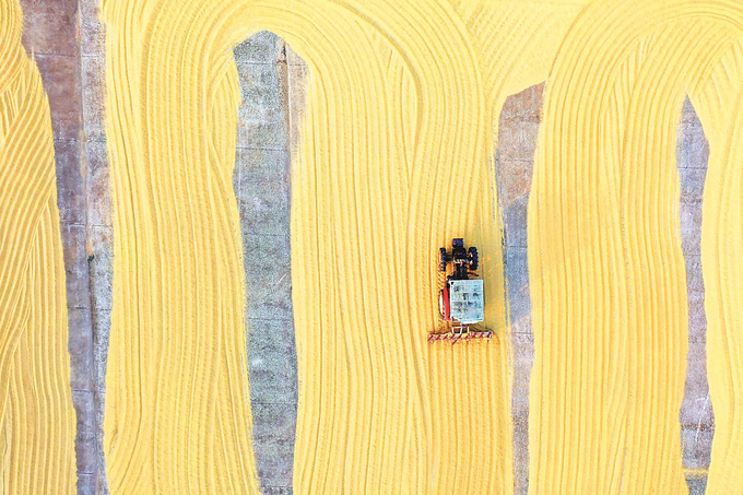 10月27日,連云港市海州區(qū)的江蘇農(nóng)墾崗埠農(nóng)場,職工駕駛糧食翻曬機械在場上來回穿梭,翻曬剛剛收獲的水稻。 陶桂軍 嚴(yán)連鳳 攝(視覺江蘇網(wǎng)供圖)