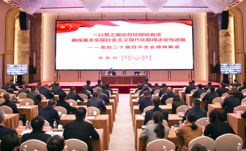 報(bào)告會上,張新科圍繞學(xué)習(xí)貫徹習(xí)近平總書記在黨的二十屆四中全會上的重要講話精神和全會《建議》,從深刻認(rèn)識黨的二十屆四中全會的重大意義,準(zhǔn)確把握“十五五”時(shí)期在基本實(shí)現(xiàn)社會主義現(xiàn)代化進(jìn)程中的重要地位,全面理解“十五五”時(shí)期經(jīng)濟(jì)社會發(fā)展的戰(zhàn)略任務(wù)和重大舉措等方面,結(jié)合我國經(jīng)濟(jì)社會發(fā)展實(shí)際情況,運(yùn)用生動案例和翔實(shí)數(shù)據(jù),進(jìn)行了系統(tǒng)闡釋和全面解讀。他指出,全會取得的重大成果、作出的重大部署,充分體現(xiàn)了以習(xí)近平同志為核心的黨中央團(tuán)結(jié)帶領(lǐng)全黨全國各族人民續(xù)寫經(jīng)濟(jì)快速發(fā)展和社會長期穩(wěn)定兩大奇跡新篇章、奮力開創(chuàng)中國式現(xiàn)代化建設(shè)新局面的歷史主動,必將對黨和國家事業(yè)發(fā)展產(chǎn)生重大而深遠(yuǎn)的影響。要把學(xué)習(xí)貫徹全會精神同學(xué)習(xí)領(lǐng)會習(xí)近平新時(shí)代中國特色社會主義思想貫通起來,結(jié)合習(xí)近平總書記對江蘇工作重要講話精神,做到學(xué)深悟透、狠抓落實(shí),奮力譜寫“強(qiáng)富美高”新江蘇現(xiàn)代化建設(shè)新篇章。