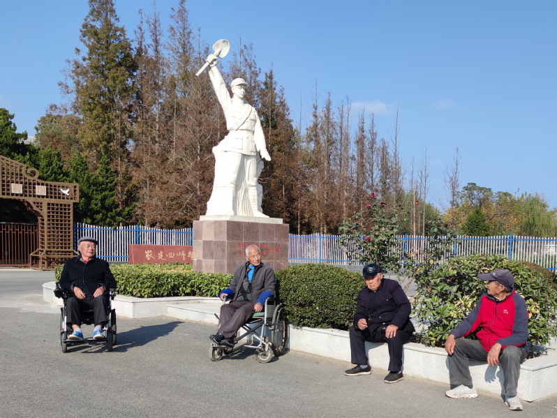 不斷前行的淮海人,扎實(shí)開展黨史學(xué)習(xí)教育,大力弘揚(yáng)軍墾精神,積極宣傳農(nóng)建四師先進(jìn)模范,用榜樣的力量感召人、鼓舞人、塑造人。農(nóng)場(chǎng)黨委開展“一個(gè)黨員就是一面旗幟”“黨員與職工結(jié)對(duì)”“黨員責(zé)任區(qū)”活動(dòng),并結(jié)合黨務(wù)公開試點(diǎn)工作和創(chuàng)先爭(zhēng)優(yōu),創(chuàng)建學(xué)習(xí)型、服務(wù)型、創(chuàng)新型黨組織等活動(dòng),加強(qiáng)農(nóng)場(chǎng)黨建工作。黨史學(xué)習(xí)教育開展以來,淮海農(nóng)場(chǎng)充分利用農(nóng)建四師陳列館這一紅色實(shí)境教育基地和健在老軍墾“活化石”的功能,讓軍墾傳統(tǒng)不斷發(fā)揚(yáng)光大。長長的黨史學(xué)習(xí)教育清單中,農(nóng)場(chǎng)黨委除常規(guī)固定動(dòng)作外,還在黨員干部和青年員工中采取征集黨史知識(shí)試題,開展黨史知識(shí)競(jìng)賽、征文等形式,將系列活動(dòng)與黨史學(xué)習(xí)教育深度融合,并切實(shí)解決職工居民的所需、所急、所難,以更好地把廣大職工居民緊密團(tuán)結(jié)在黨的周圍,為企業(yè)改革發(fā)展貢獻(xiàn)力量。圖為農(nóng)場(chǎng)老軍工在為學(xué)生說傳統(tǒng)和健在的老軍墾坐在雕像前回憶曾經(jīng)的風(fēng)花雪月。