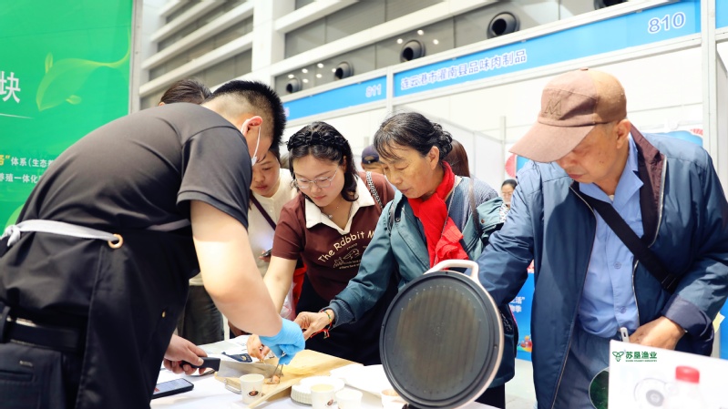 在剛剛結束的2025“蘇新消費·夏夜生活”暨連云港第六屆網(wǎng)絡購物節(jié)上,蘇墾漁業(yè)的鮮蝦餅、金沙蝦球、蝦滑等對蝦系列產(chǎn)品開售兩小時便被搶購一空。圖為顧客現(xiàn)場品嘗對下系列產(chǎn)品。
