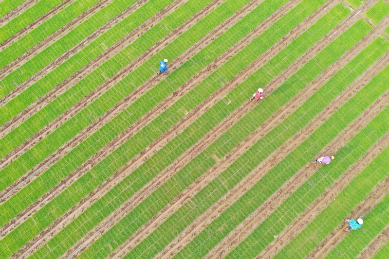 5月29日,蘇墾農(nóng)發(fā)江心沙分公司工人在田間忙著揭膜煉苗、躬身巡苗、定點查苗,為肥水管理和病蟲害防治提供參考,確保育出適齡壯秧,按時移栽。