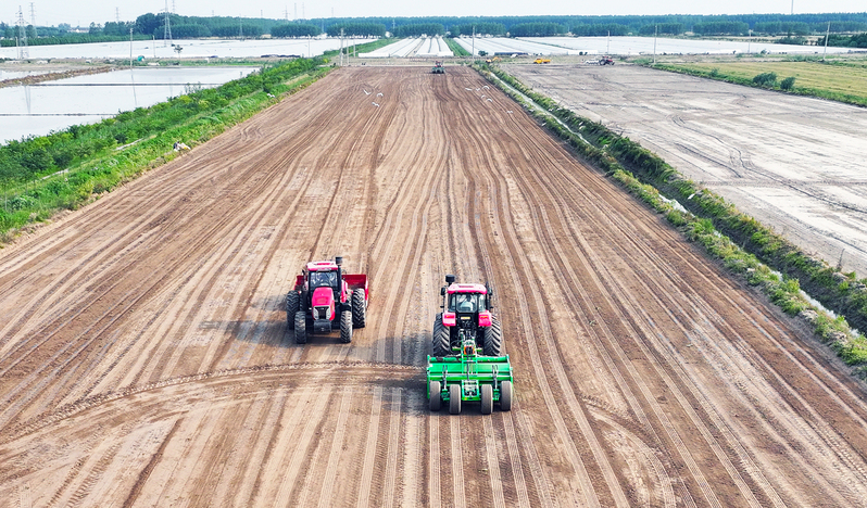 5月25日,蘇墾農(nóng)發(fā)弶港分公司第二生產(chǎn)區(qū)8連田間,北斗衛(wèi)星導航鏟運機、激光平整機等25臺套大型機械來回穿梭,全力推進土地平整進度。